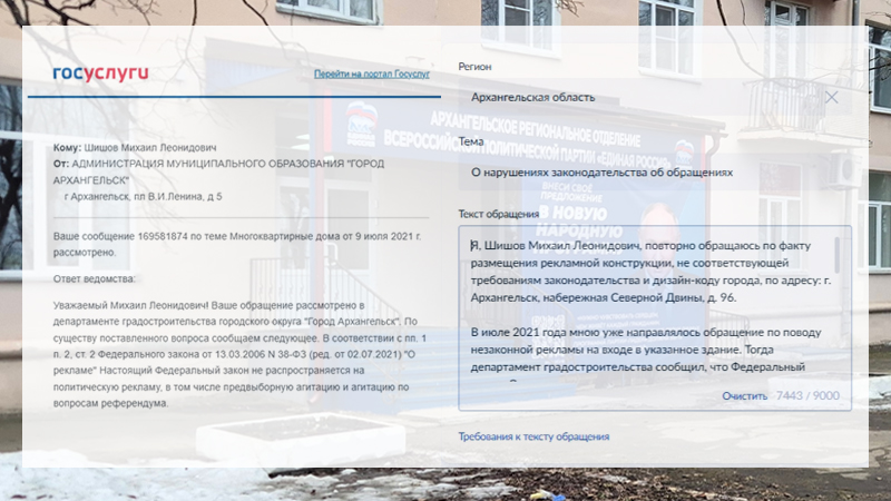 К слову, он уже намекал об этом несколько лет назад, отправив соответствующий сигнал через портал Госуслуг в местную администрацию, но получил тогда «от ворот поворот» из департамента градостроительства, сославшегося в ответе на некие исключения из правил, предусмотренные для политической рекламы и агитации. «То, что висит сейчас, — не имеет никакого отношения ни к политике, ни к выборам, ни к референдумам, — говорит Михаил Шишов. — Это просто незаконно размещённая вывеска, которая к тому же не соответствует дизайн-коду Архангельска». В поисках справедливости известный архангельский покоритель дорожных ям обратился в прокуратуру с требованием провести проверку по данному факту с целью устранения возможных нарушений и привлечения к ответственности лиц, годами закрывающих глаза на очевидные вещи.